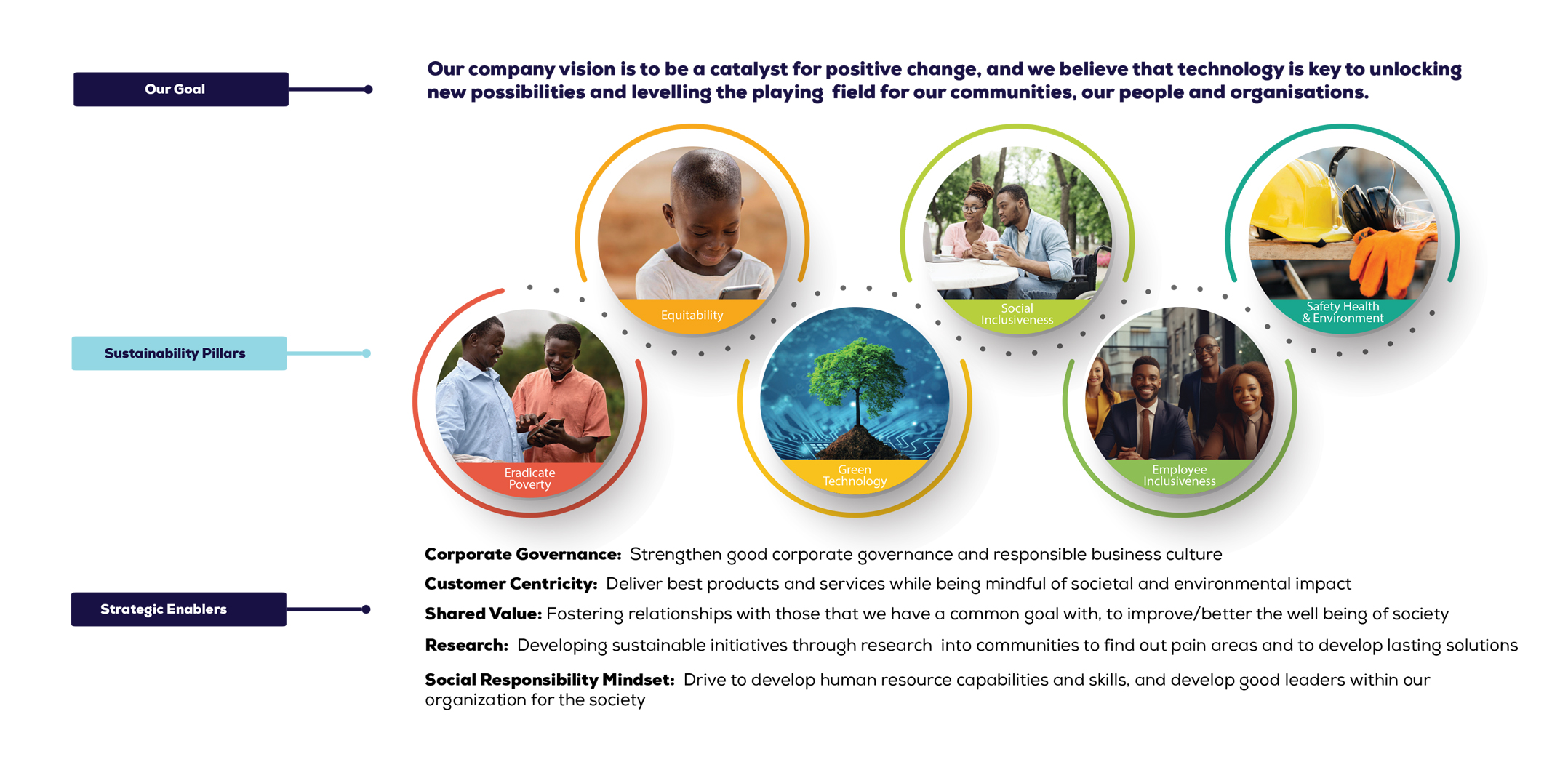 To foster inclusive prosperity and community empowerment, we envision a future where every marginalized area thrives with equitable access to essential infrastructure and services. Through our unwavering commitment to corporate social investment, we aspire to uplift local businesses and empower communities, catalysing sustainable growth and fostering a world where no one is left behind.